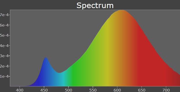 As it so happens LEDs don’t actually have a broad spectrum like this so what the light bulb manufactures do is get LEDs that do blue/UV and then coat the inside of the bulb with something that absorbs blue/UV and emits a broad spectrum. As you can see this is gonna be much closer to an incandescent but blue things will be a little too bright.